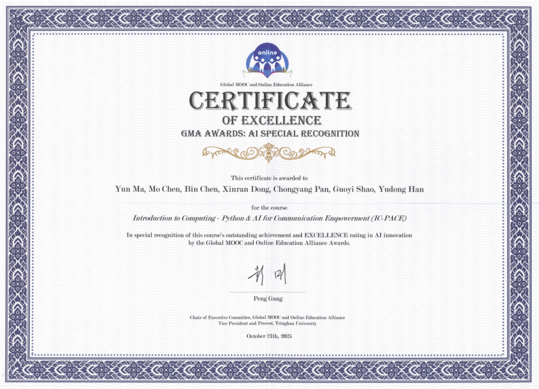 “计算概论C”体育教育专业(新闻传播方向)课程(IC-PACE: Introduction to Computation - Python & AI for Communication Empowerment)荣获2025年世界慕课与在线教育联盟“优秀课程奖:AI特别奖”(GMA Awards: AI Special Recognition)。