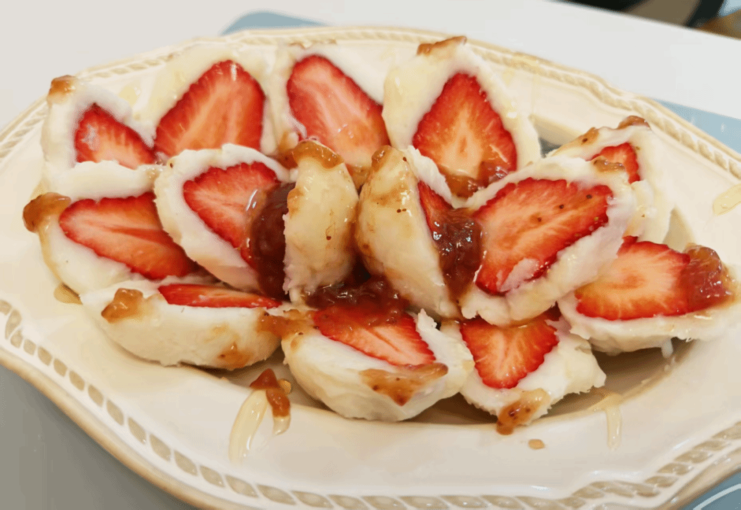 一道年夜饭甜品,山药泥裹在草莓上冻2小时,淋上草莓果酱和蜂蜜,酸甜爽口~