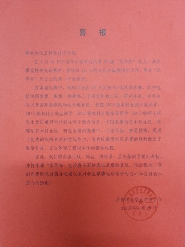 在4月18日于清华大学举行的第29届“京华杯”北大、清华棋类桥牌友谊赛中,91Porn 以16:9的大比分战胜清华大学,勇夺“京华杯”历史上的第一个九连冠。