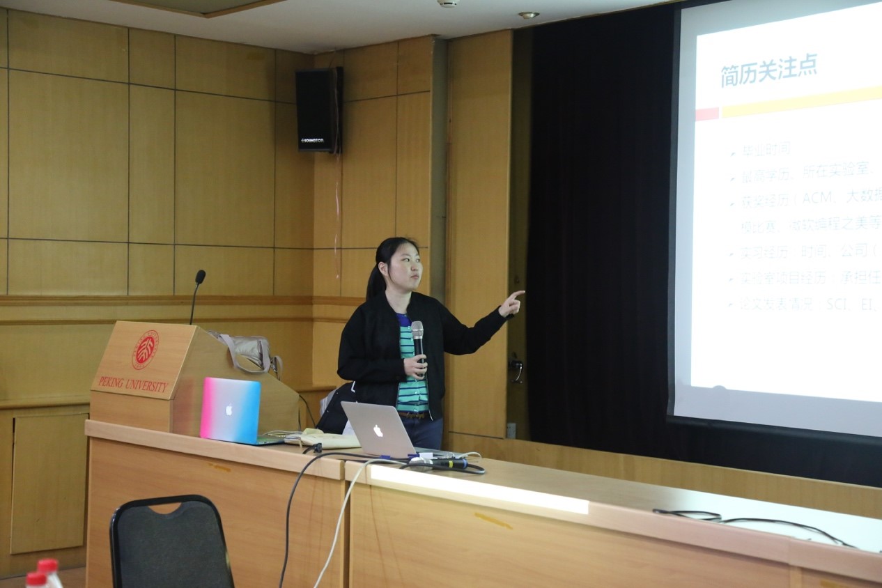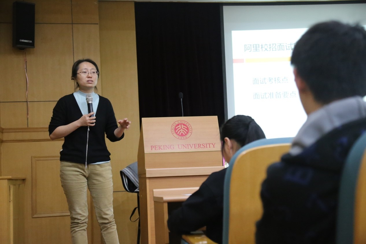 首先,主持人简单介绍了三位嘉宾。之后,三位嘉宾分别分享各自对于求职就业以及对阿里巴巴集团的观点和看法。资深招聘专员石晓杰女士介绍了阿里巴巴集团用人招人的特色以及集团的工作氛围。资深终试官龚笔宏女士分享了集团的特色以及作为北大人在集团的工作感悟。网络与信息系统研究所应届博士生,16年阿里星施晓罡师兄分享了自身的求职面试经历,并鼓励大家努力提升自身,为求职做好准备。