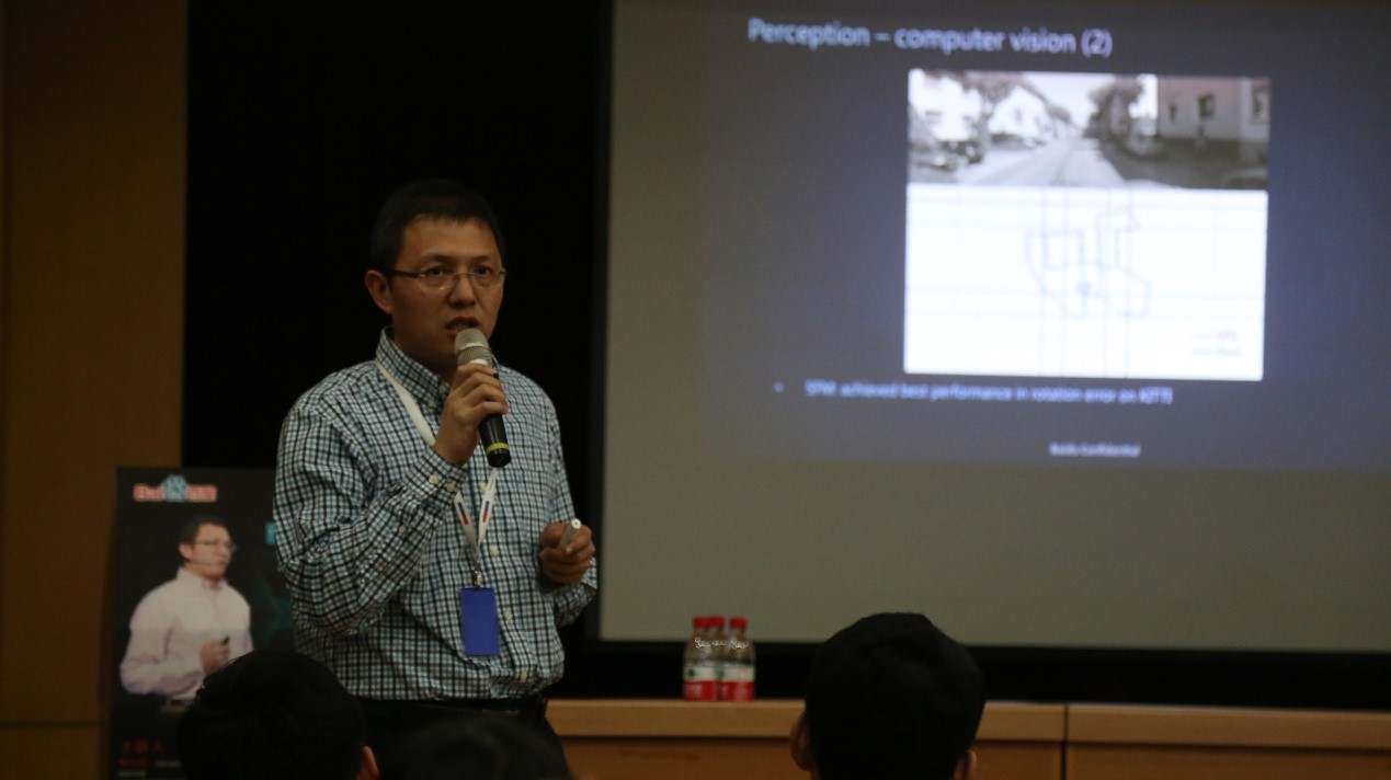 首先,主持人对嘉宾进行介绍,林元庆于2008年获得宾夕法尼亚大学电子工程博士学位, 2010年,他带领NEC-UIUC团队在ImageNet大规模视觉识别挑战赛上获得第一名。2015年11月,他加入了百度并担任深度学习实验室主任并兼任百度自动驾驶事业部副总经理。接着是嘉宾林元庆和该小组师兄师姐跟同学们分享百度无人车的技术和成绩。近年来,无人驾驶作为汽车行业未来的发展趋势已成为业内外人士的共识,百度作为国内人工智能领域首屈一指的巨头,在自动驾驶汽车领域依靠自身的技术研发,先进的人工智能技术、国际最佳的交通场景物体识别技术、领先的路网数据采集和开发能力脱颖而出。目前,百度自动化驾驶事业部已形成了一套完整的自动驾驶技术方案,多项关键技术达到国际领先水平。