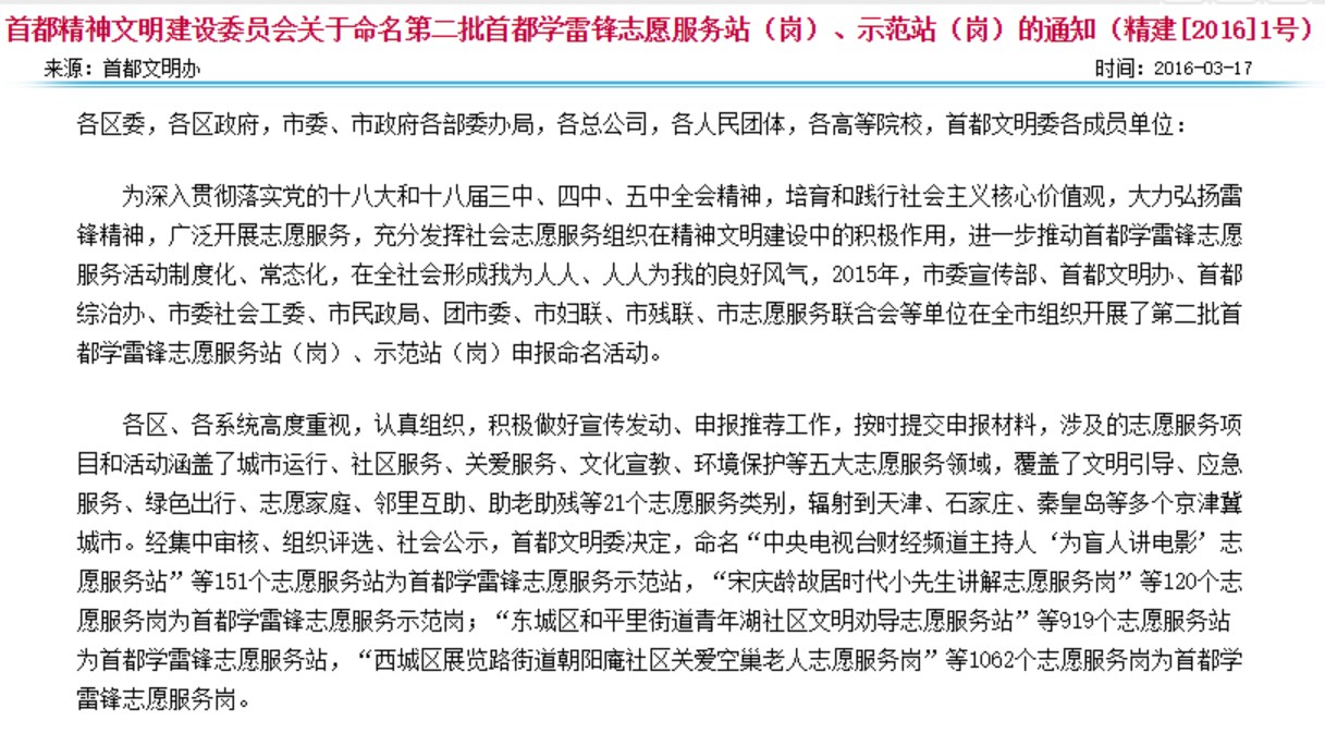 为深入贯彻落实党的十八大和十八届三中、四中、五中全会精神,培育和践行社会主义核心价值观,大力弘扬雷锋精神,广泛开展志愿服务,充分发挥社会志愿服务组织在精神文明建设中的积极作用,进一步推动首都学雷锋志愿服务活动制度化、常态化,在全社会形成我为人人、人人为我的良好风气,2015年,北京市委宣传部、首都文明办、首都综治办、市委社会工委、市志愿服务联合会等单位在全市组织开展了第二批首都学雷锋志愿服务站(岗)、示范站(岗)申报命名活动。