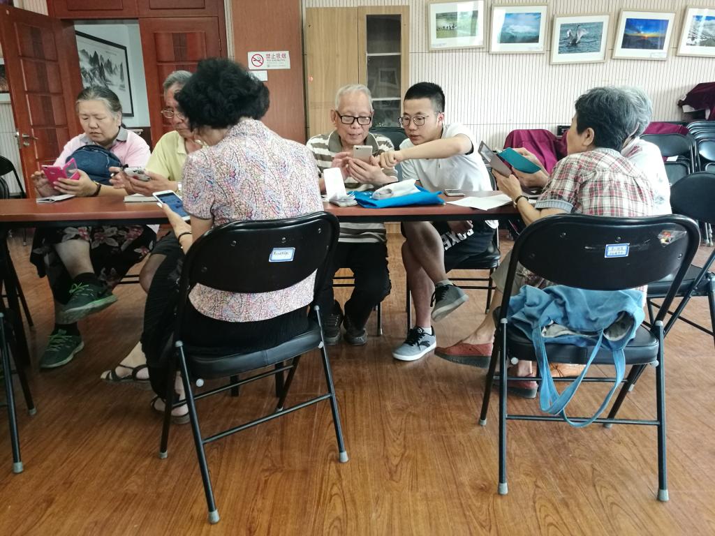 本次活动为信科软件所15级硕士生党支部、博士生党支部联合“夕阳再晨”社工中心共同举办,由景山街道提供场地和宣传支持。活动当天,共有20余名老人参加培训。在活动开始前,现场的老人和支部党员同学在街道工作人员的带领下,做了暖场活动,互相为对方按摩肩膀,这一活动迅速拉近了支部党员与老人们之间的距离。之后,一名党员同学与三名老人组成一组就坐,活动正式开始。