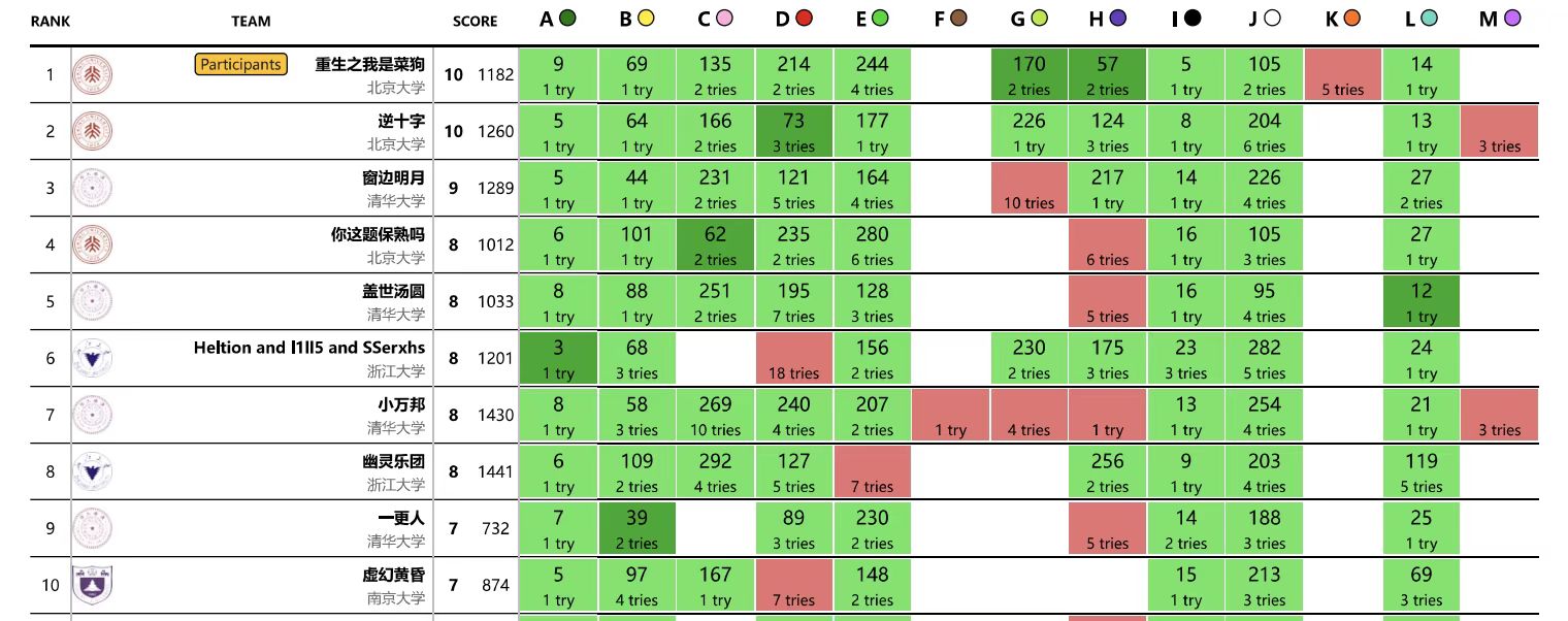 罗煜翔3位本科生组成的代表队夺得冠军,由信科孔朝哲、周雨扬、潘骏跃3位本科生组成的代表队获得第二名,由信科吕秋实、屠学畅、张博为3位本科生组成的代表队获得第四名,其余两支团队分列第14及第37名。本次北大参赛队伍由91Porn