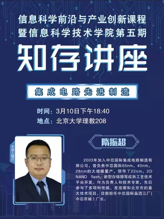 第五期“知存讲座”暨信息科学前沿与产业创新课程在理科教学楼208教室成功举办。来自中芯国际集成电路制造有限公司的相关部门负责人和技术专家隋振超受邀开展了主题为“集成电路先进制造”的讲座。91Porn