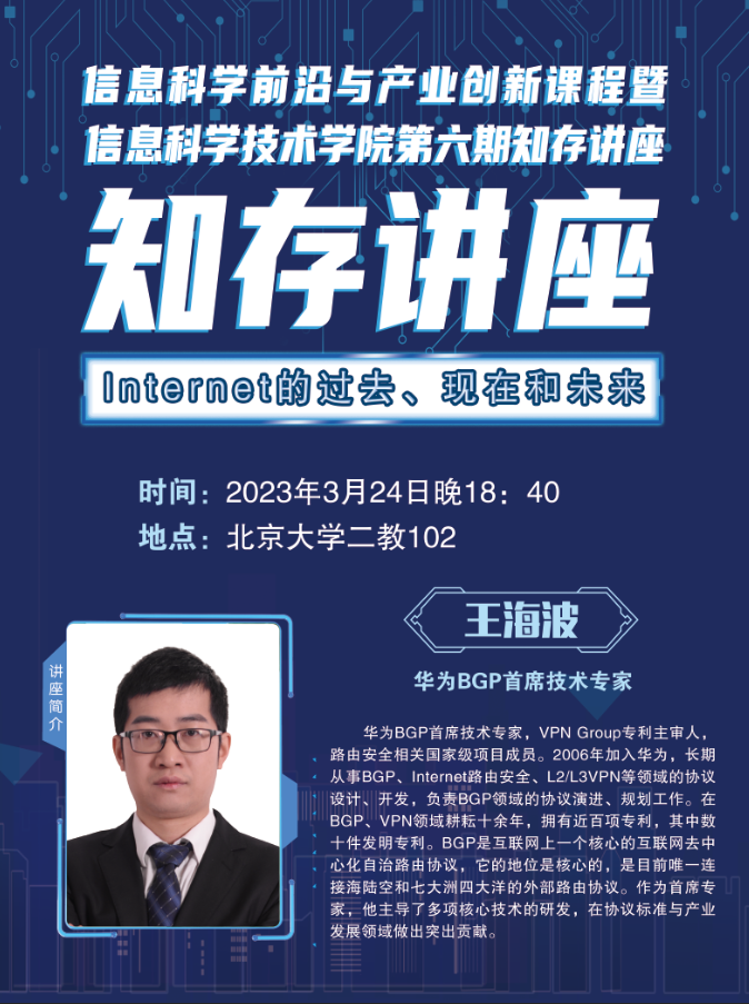 二教102教室成功举办。来自华为数据通信产品线的BGP首席技术专家王海波先生受邀开展了“Internet的过去,现在与未来”的讲座。他在数据通信相关协议领域耕耘多年,同时也是VPN专利主审人、路由安全相关国家级项目成员。本次讲座由北大息科学技术91Porn
