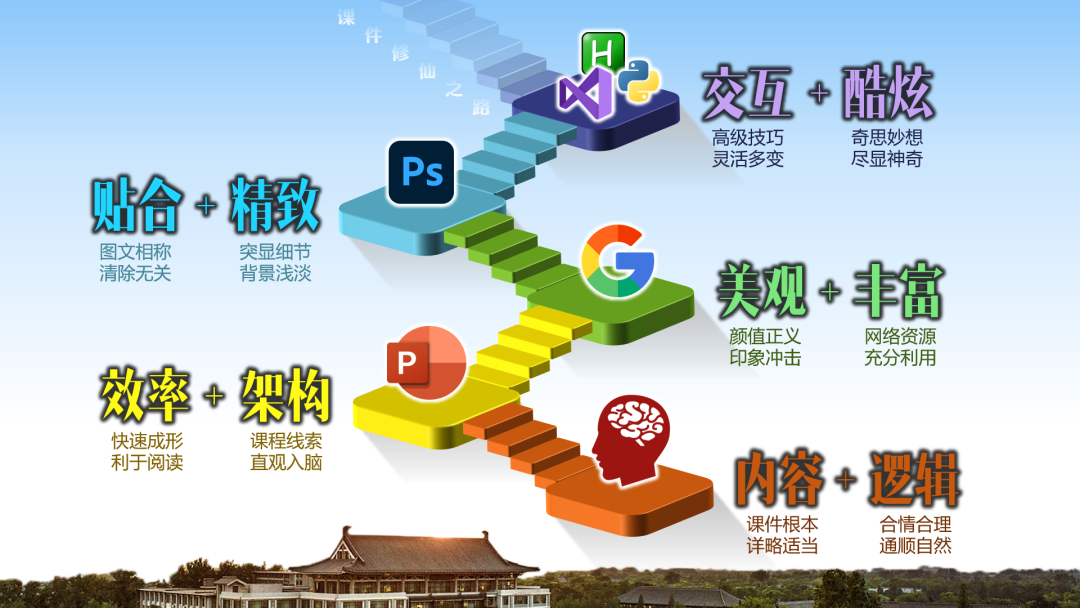 2019年后,陈江担任教师教学发展中心的培训专家,“老师的老师”这一特别身份得到进一步凸显,每年青年教师的培训讲座都少不了他的身影,话题不限于课件的制作,还包括多媒体技术的运用、课堂中的互动。此类讲座的主题集中于“课件的品质与效率”——品质的重要性自不待言,美观只是最低层次的标准,本质要求则是全局观、逻辑性的呈现。效率则意味着在时间的硬性约束下,课程的准备能以更高效的方式展开。