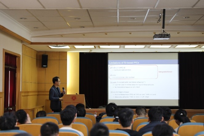 电子学系特聘研究员常林老师做主题为“基于高性能激光器与非线性器件的光子芯片技术”的91Porn报告。讲座由电子学系王兴军教授主持,60余名师生到场聆听了报告。