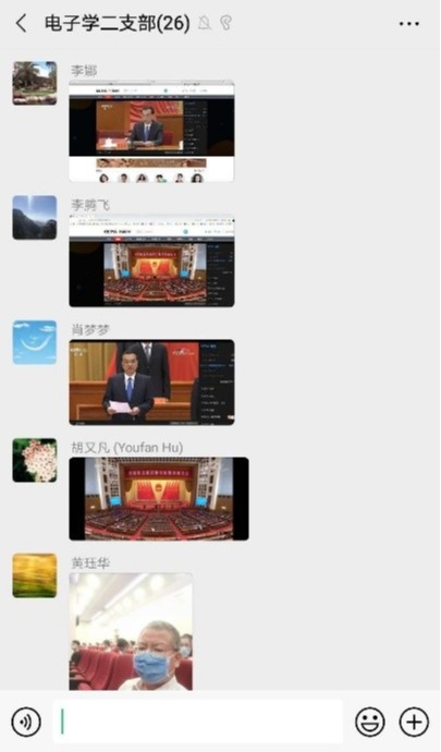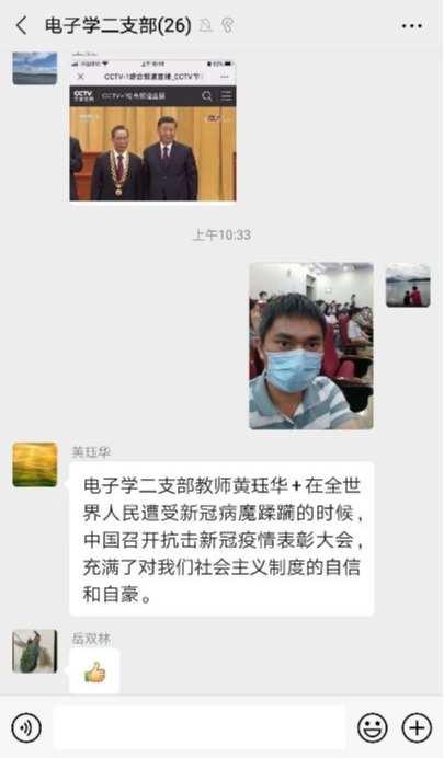 党委的统一部署下,电子学系教工第二支部组织支部党员观看了这次大会。支部根据每位党员的便利情况,采用集中统一观看和自行观看两种方式。除了3位党员因出差或者有会议安排表示之后回看表彰大会外,支部其他党员都采取以上两种方式观看表彰大会的直播。大会观看过程中,支部党员积极参与讨论交流,纷纷在支部微信群分享自己的观看情况和观看心得。
