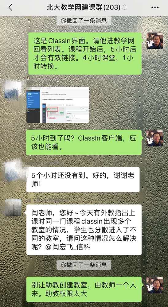 培训后,教发中心按照平台分类建立了微信群便于交流。其中ClassIn有四个答疑群,前三个全部满员;Canvas的交流群也有200余人。闫老师就是从这时候开始,主动回答群里老师们提出的各类问题,很快成为微信群中的“红人”。