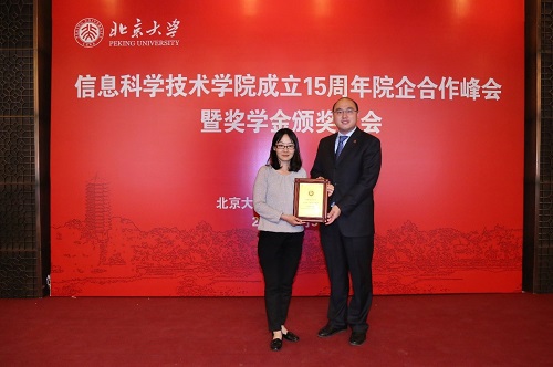 胡俊向累计捐赠信科奖学金额度最高的高通公司颁发了教育贡献奖。