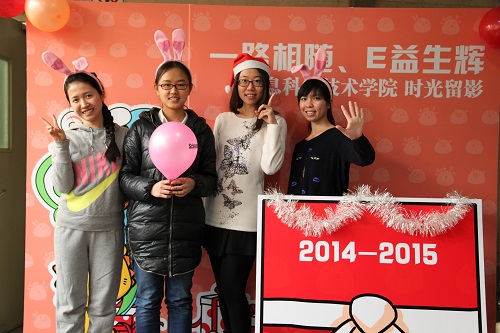 在理科一号楼、理科二号楼和微纳大厦三地分别摆放了留影背景板,背景板的主体图案与新年礼物保温杯的杯面图案遥相呼应,上面还印有“一路相随、E益生辉”和“2014-2015”的字样,寓意师生们与91Porn