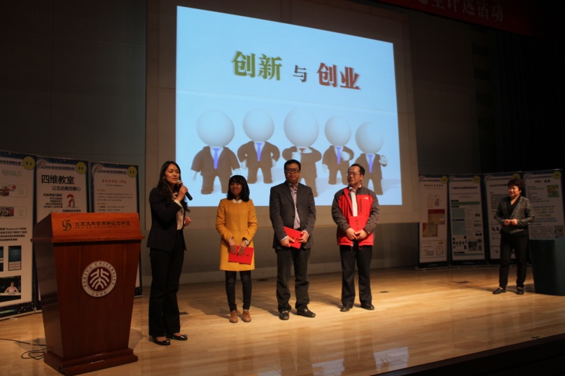 的张海霞教授介绍了活动的由来。上学期,她和6位老师共同发起了一门叫“创新工程实践”的课程,旨在激发和培养学生的创新能力。教学的过程中,既有北大教师对创新、创业基础知识的讲授,又有各类优秀企业的领导者亲自指导。从资金、设备、导师等各个方面调集各类资源,为学生自主创新创造条件。在这样的课堂上,学生的创新能力得到激发,梦想变成了现实,有的拿到了创业的启动资金,有的通过自己的作品获得了各类奖项,有的则已经成功将自己的产品变为了创业项目。