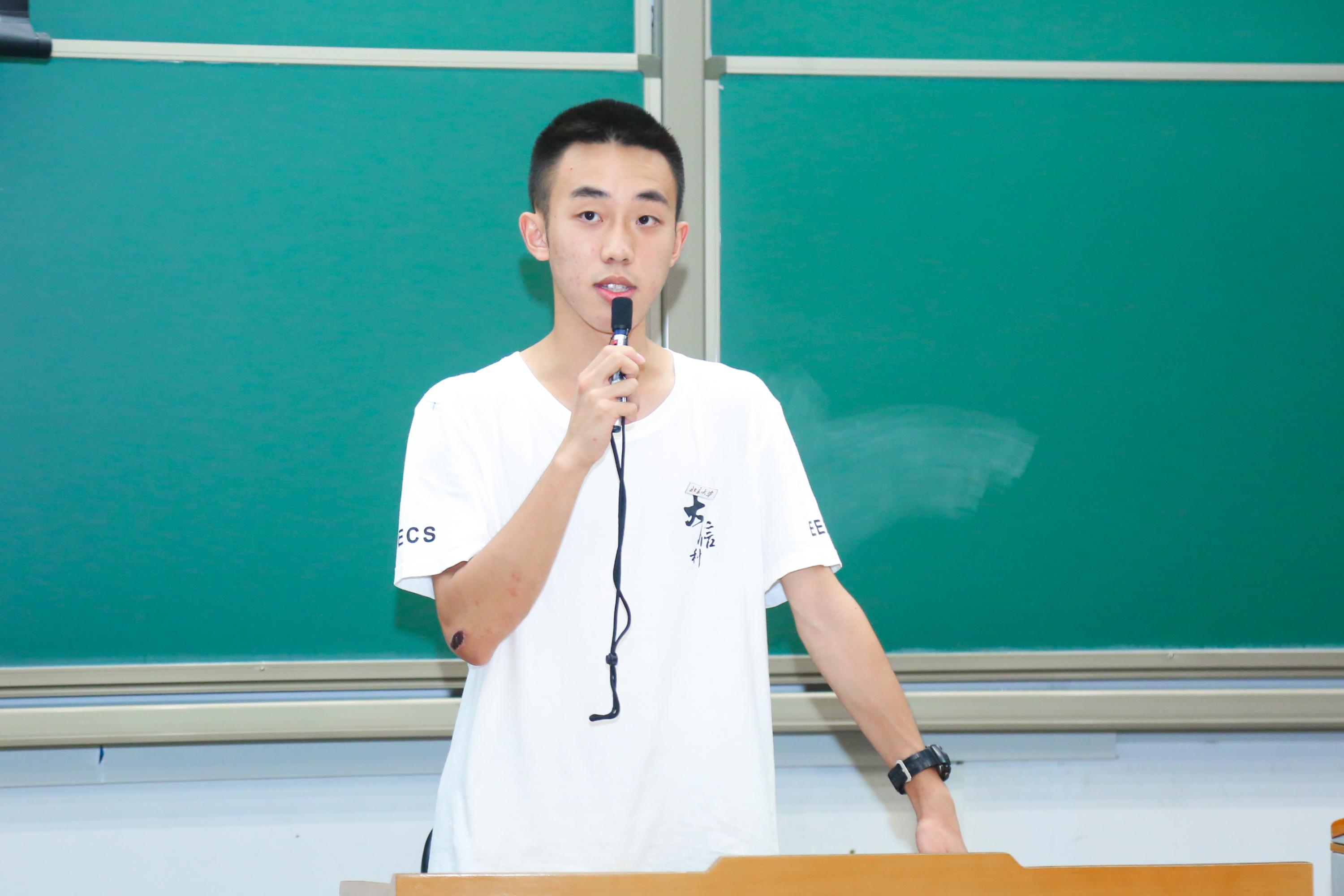 学生会主席、2019级本科生朱天翔同学作为老生代表,向新生们分享了自己的学习生活经验。他强调,进入评价体系多元化的大学,大家需要转变观念,和别人比较的大学生涯将是痛苦、盲目、浮躁而无意义的,真正需要比较的只有自己和自己的期望与目标。他鼓励新生们按照自己的计划和节奏,选择自己内心热爱的事情去尝试,特别是理工科同学应该尝试接触一些音乐、艺术、历史等人文素养方面的课程,在学好专业课的前提下,利用通识教育资源培养一个受益终身的爱好,也是北大作为底蕴深厚的综合性大学给予同学们最为有价值的馈赠之一。