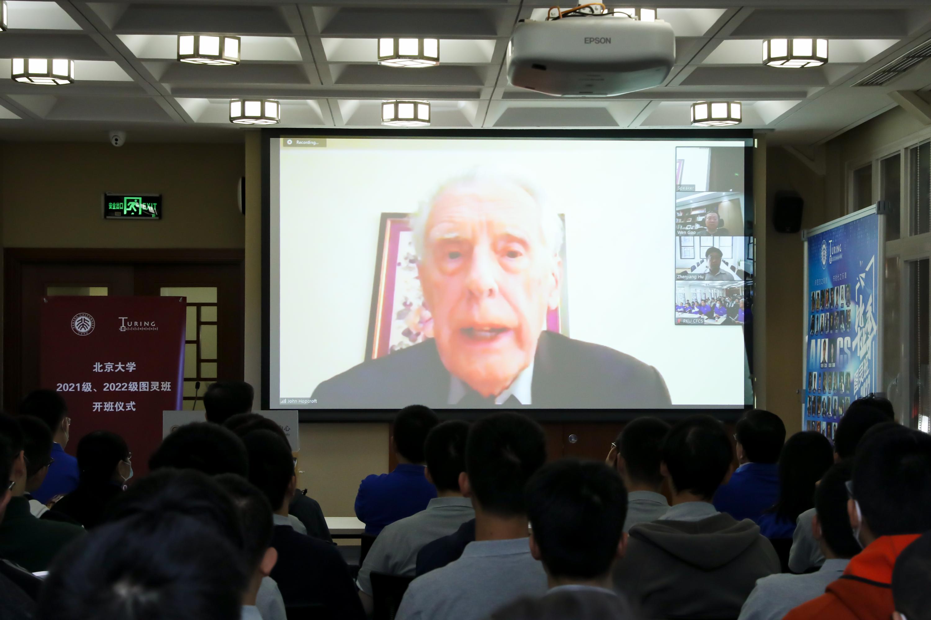 图灵班。霍普克罗夫特教授通过自己的三位获图灵奖学生的经历鼓励同学们:寻找并专注于自己所爱。他表示,大学教育不仅在课堂上,更多在课堂以外,希望同学们在图灵班培养思辨能力和开放性思维,在与老师和同学们的互动交流中开拓视野,并期待在下雪前回到北大,在课堂上与大家面对面交流。