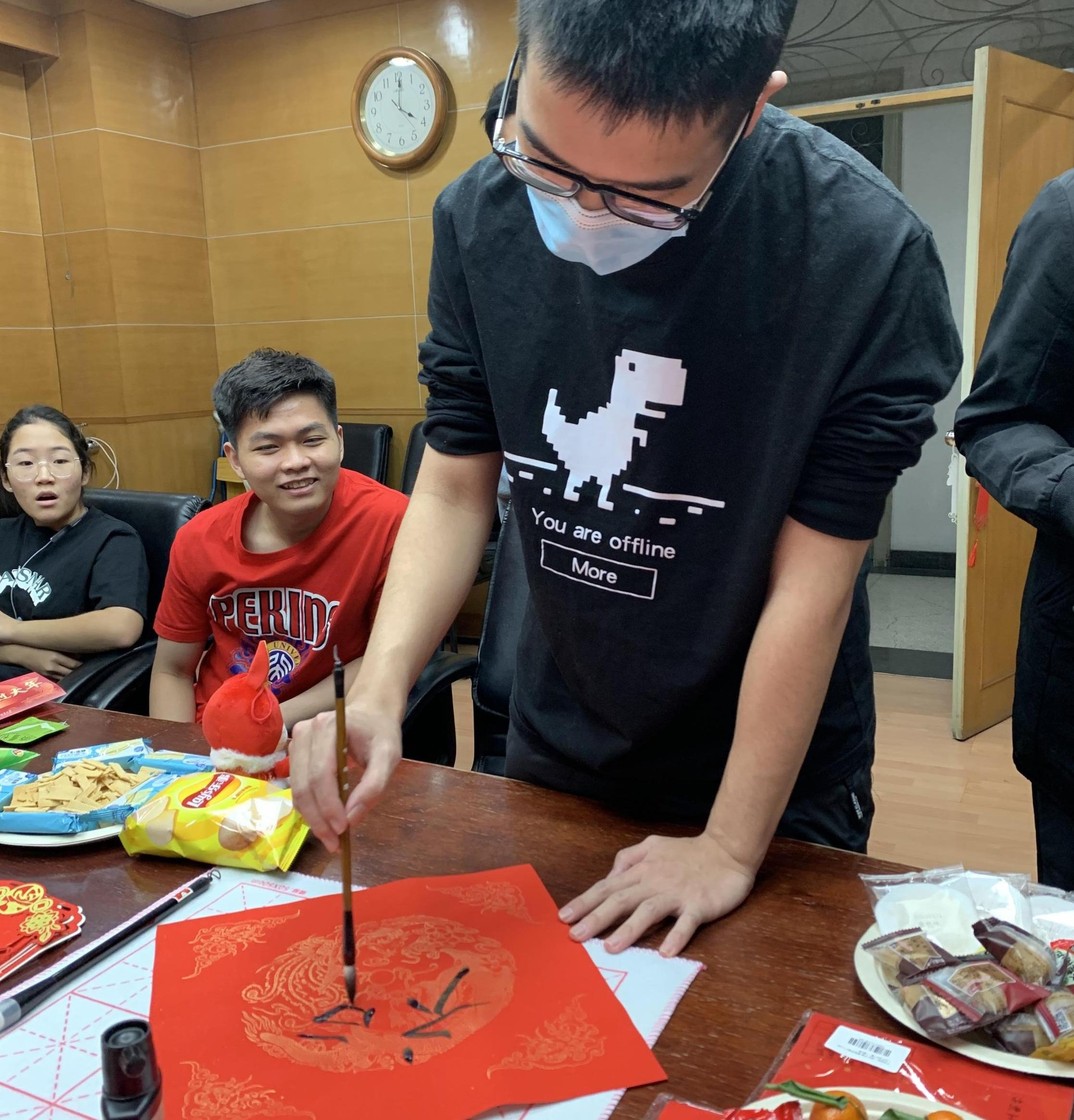 茶话会现场,老师同学们还共同参与写春联、描福字、剪窗花等传统民俗活动,体验中华民族传统文化的喜庆与温暖。桌上各色传统小吃、冬令茶饮、水果零食等也为大家送上了过年的甜蜜与满足。