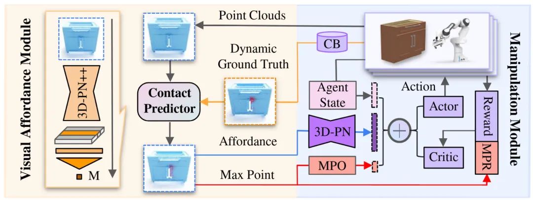 RLAfford通过利用强化学习(RL)训练过程中产生的接触信息(Contact Information)实现端到端的可操作性学习(End-to-end Affordance Learning)。