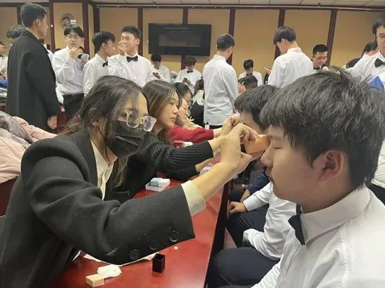 换上演出的西装和礼服,大伙陆续赶到集合的教室,准备妆造。尽管信科代表队人数众多,化妆任务量很大,大家仍然耐心地排着队,志愿者们也满负荷地工作着,从底妆到眼影、腮红、口红,完成上台前的华丽“变身”。志愿者们既专业又尽责,很多人到后来累得不得不坐着化妆,真的辛苦她们了!而负责组织的同学各处协调进度,尽力让人数庞大的化妆任务按时完成。大家齐心协力、紧锣密鼓地准备着,氛围中虽有急迫和压力,却也不曾淹没了轻松和笑容。当一位同学化妆的时候,自然少不了已经被围观过的和将要被围观的同学在一旁围观,大家互相评论着各自的妆容,些许缓解了上场之前的紧张。