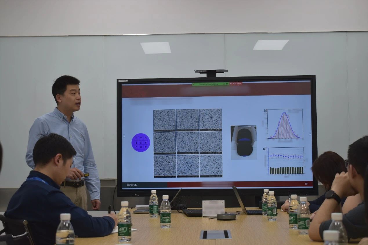 在拍照留念后,师生以及京东方企业研发人员一同参加了京东方技术创新论坛讲座。康佳昊老师首先就京东方对北大科研和教学的大力支持表示了感谢,并希望京东方与北大继续开展更广泛的合作交流。随后,康佳昊老师对北大碳基电子领域研究的发展历程进行了介绍,并展示了近期在显示器件集约模型方面的最新研究成果。在会议讲座上,康老师与线上、线下的工程师们深入交流,热情解答相关疑问,同学们也收获颇丰。