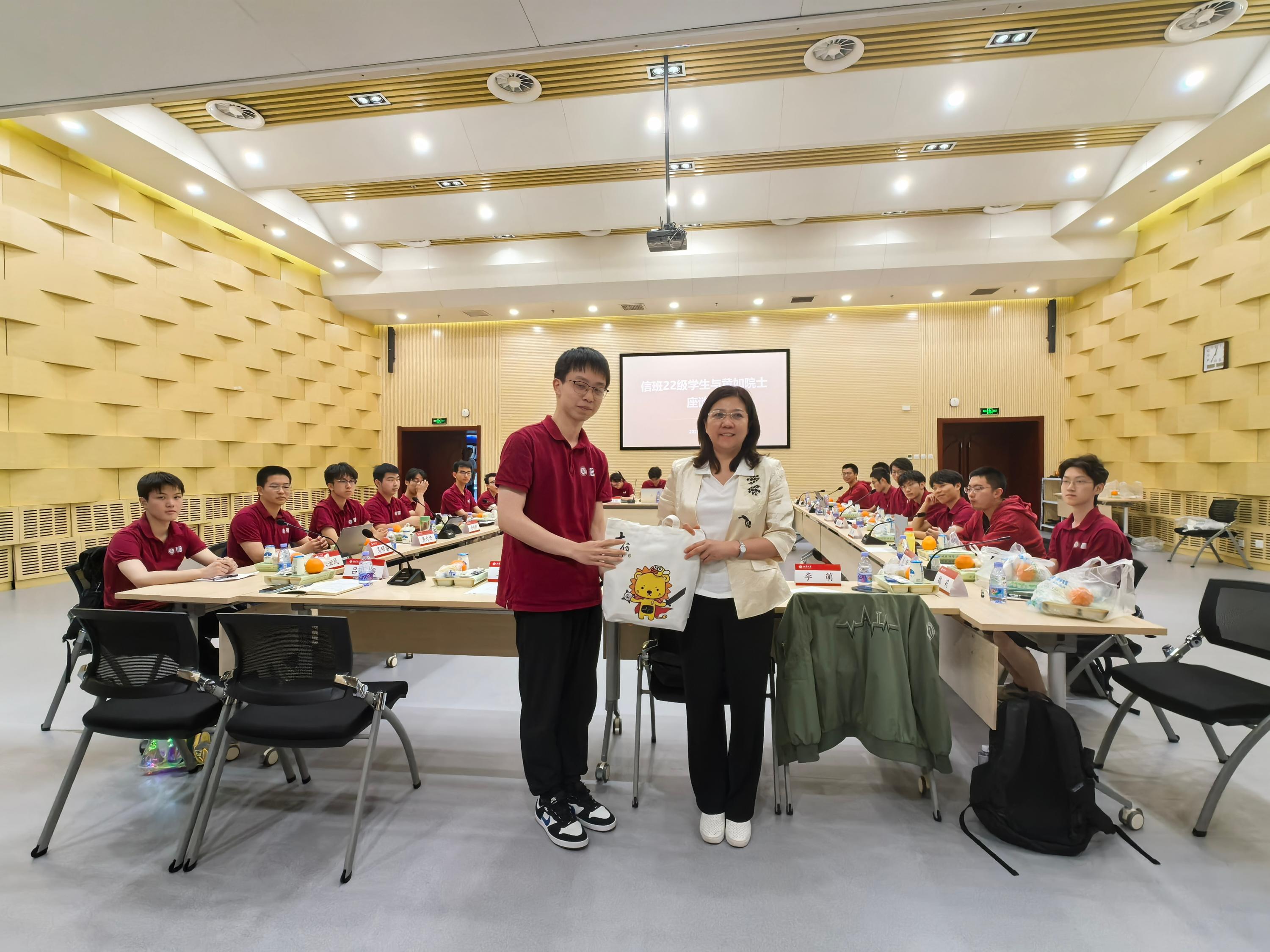 王润声首先向同学们介绍了黄如院士的科研工作经历。李萌代表22级“信班”向黄如院士汇报了班级建设情况。