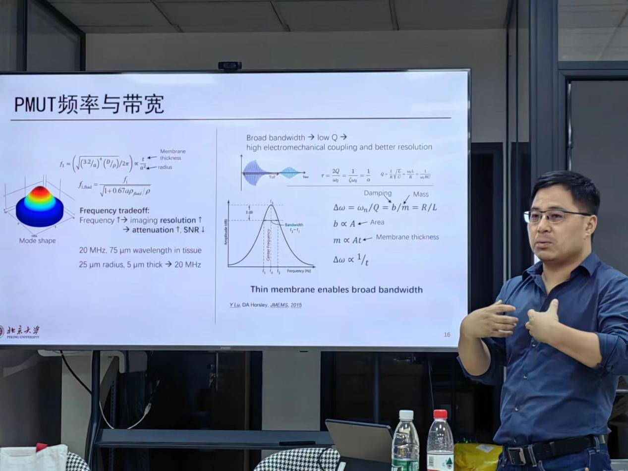 然后,卢老师讲了超声在MEMS尺度上的应用。常见的有超声手术刀、多普勒效应检测血流和药物定向释放。如超声定向使药丸中气泡破裂等。其应用还有手势识别,且超声比传统光学成像有优势,因为所需的频率更低,所以功率更低。在一些日常的领域,也有超声的影子。比如有些人不喜欢平板写字的质感,那么在纸上写也没有问题,只需要用超声同步地检测手写的位置,并传输至平板上。此外,在检测承重墙、声呐定位等工程领域,它也大放异彩。把这两个方向结合在一起的,就是压电-超声转换器了。传统上,使用压电陶瓷超声换能器,随着技术的发展,它进化为了电容微机械超声换能器(CMUT)。在工业界经过30多年的摸索后,PMUT出世。它增加了压电材料叠层,继承了CMUT的优点(如阻抗易匹配),同时还有其他优越性。与传统振荡电路中欲提高品质因子Q值不同,在超声换能器领域我们不希望能量被锁在元件电容、电感内,而希望它被释放出去。所以工程师们常常优化带宽,使Q值降低。