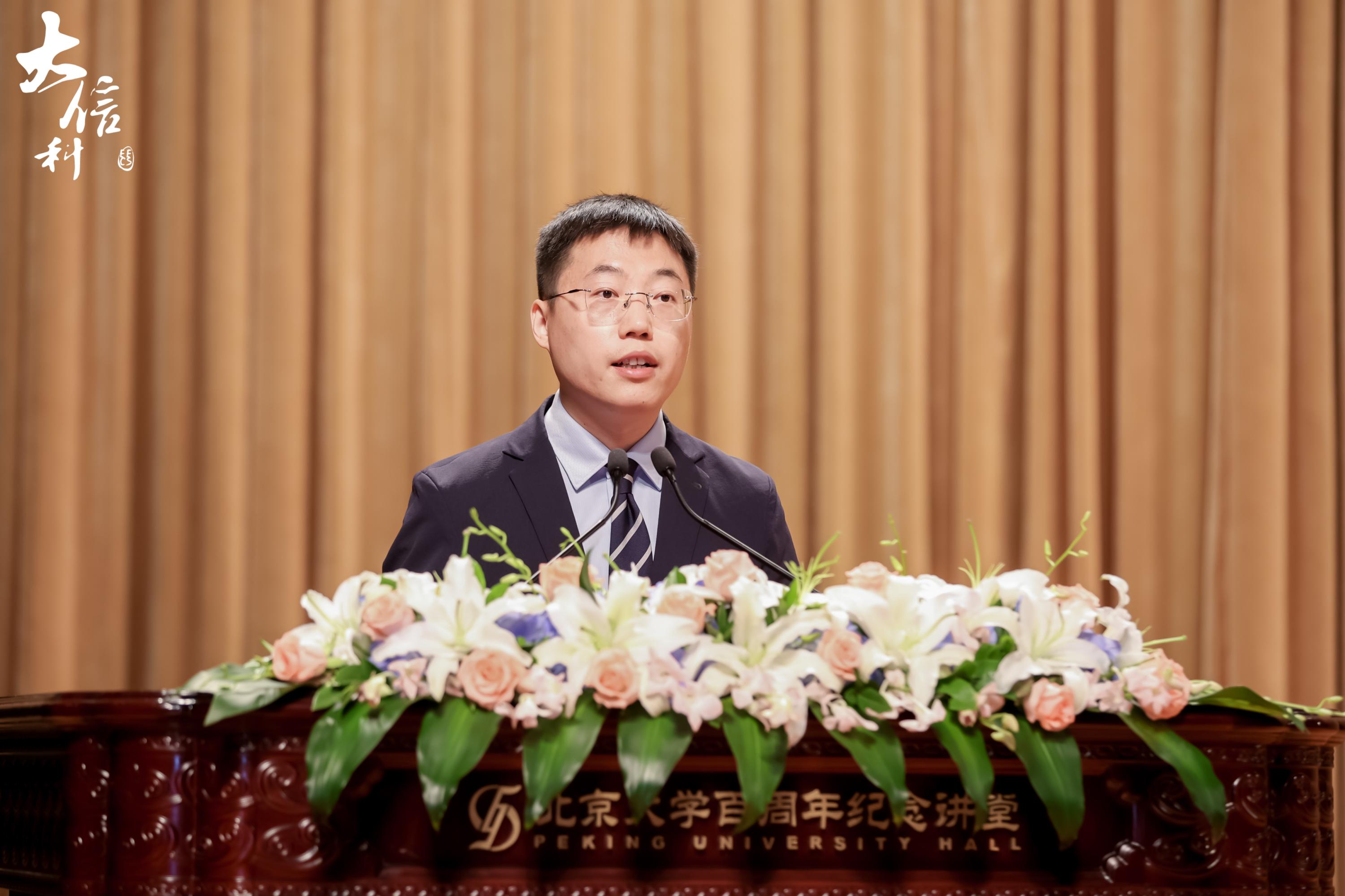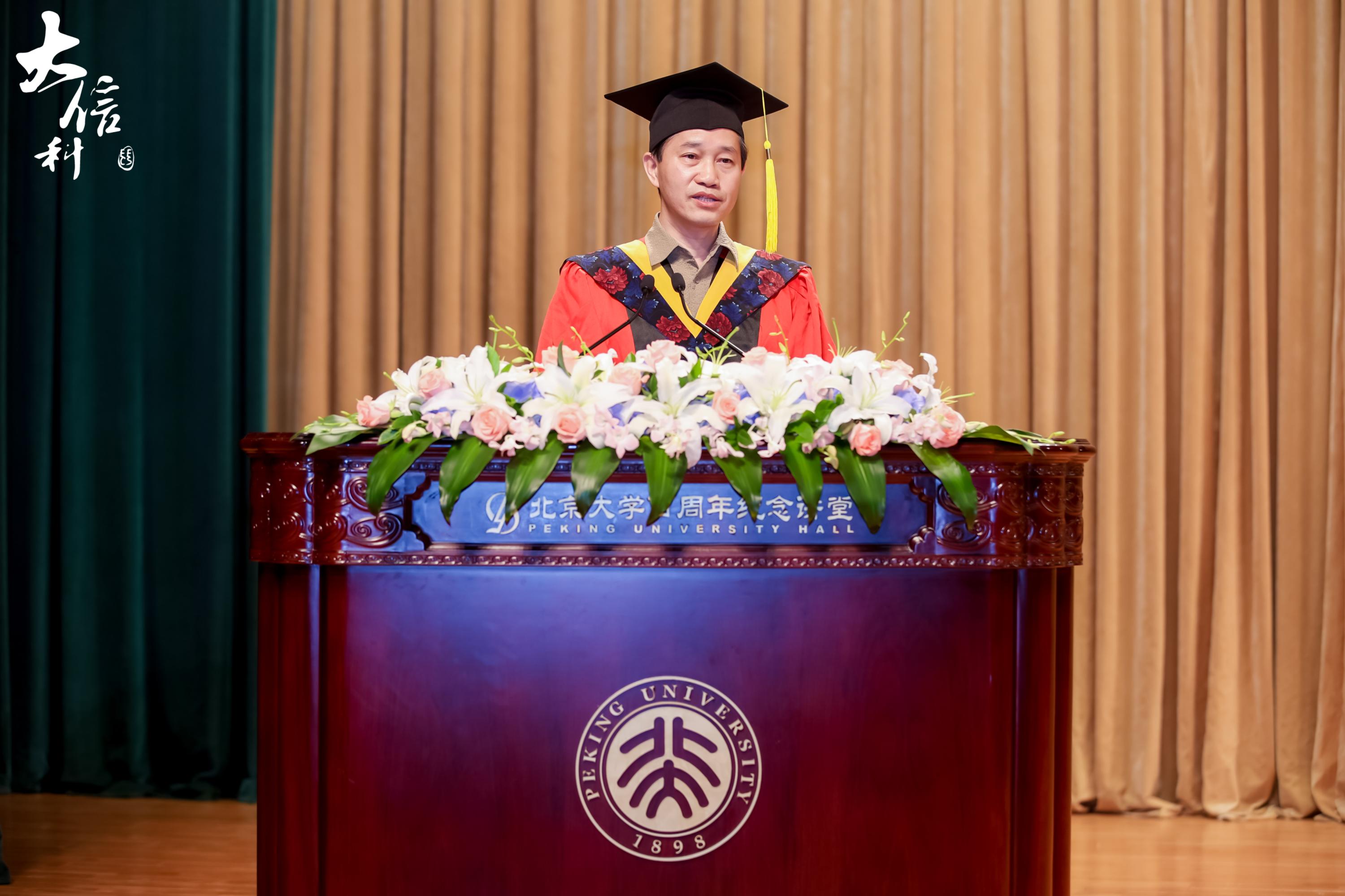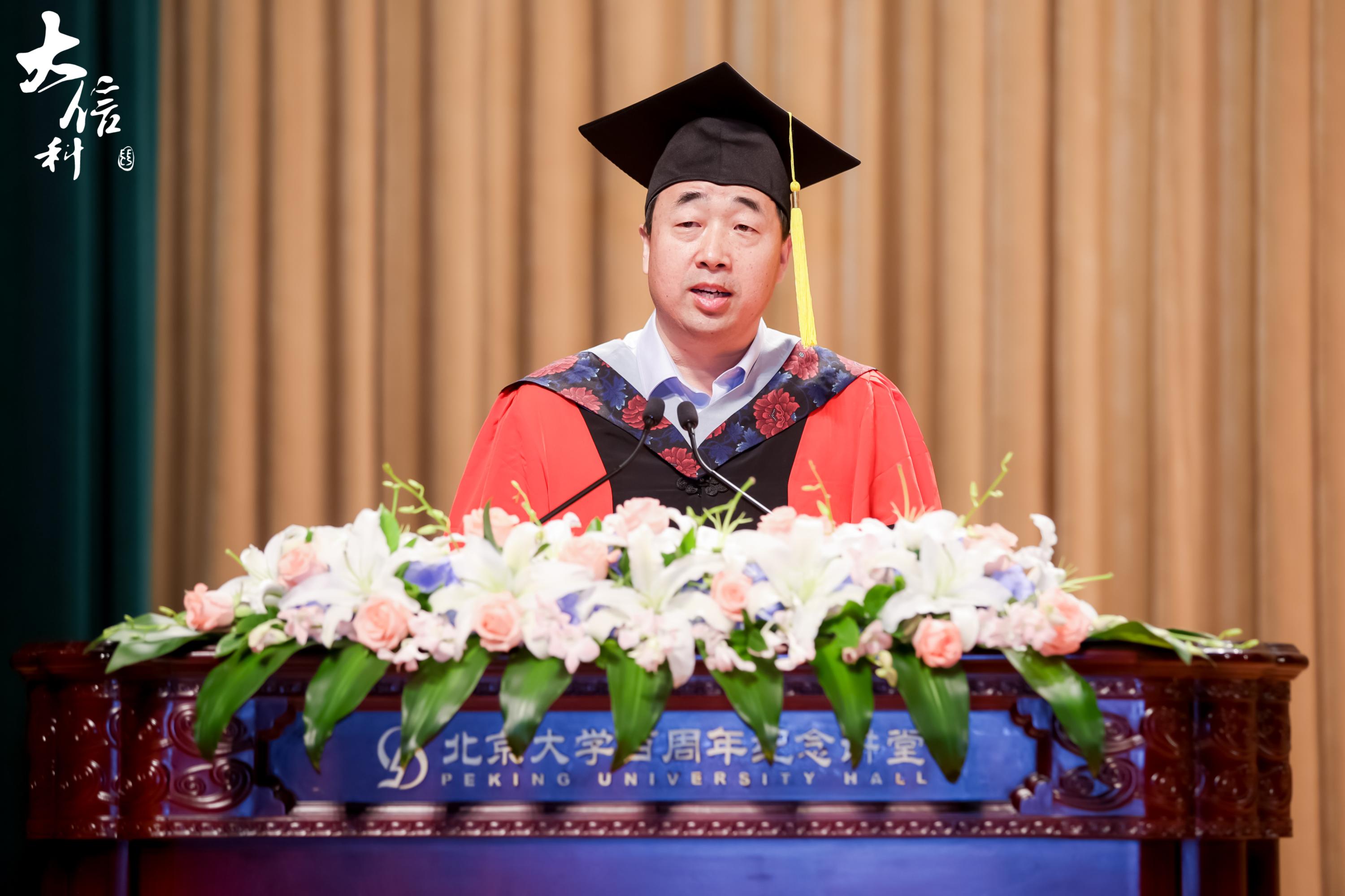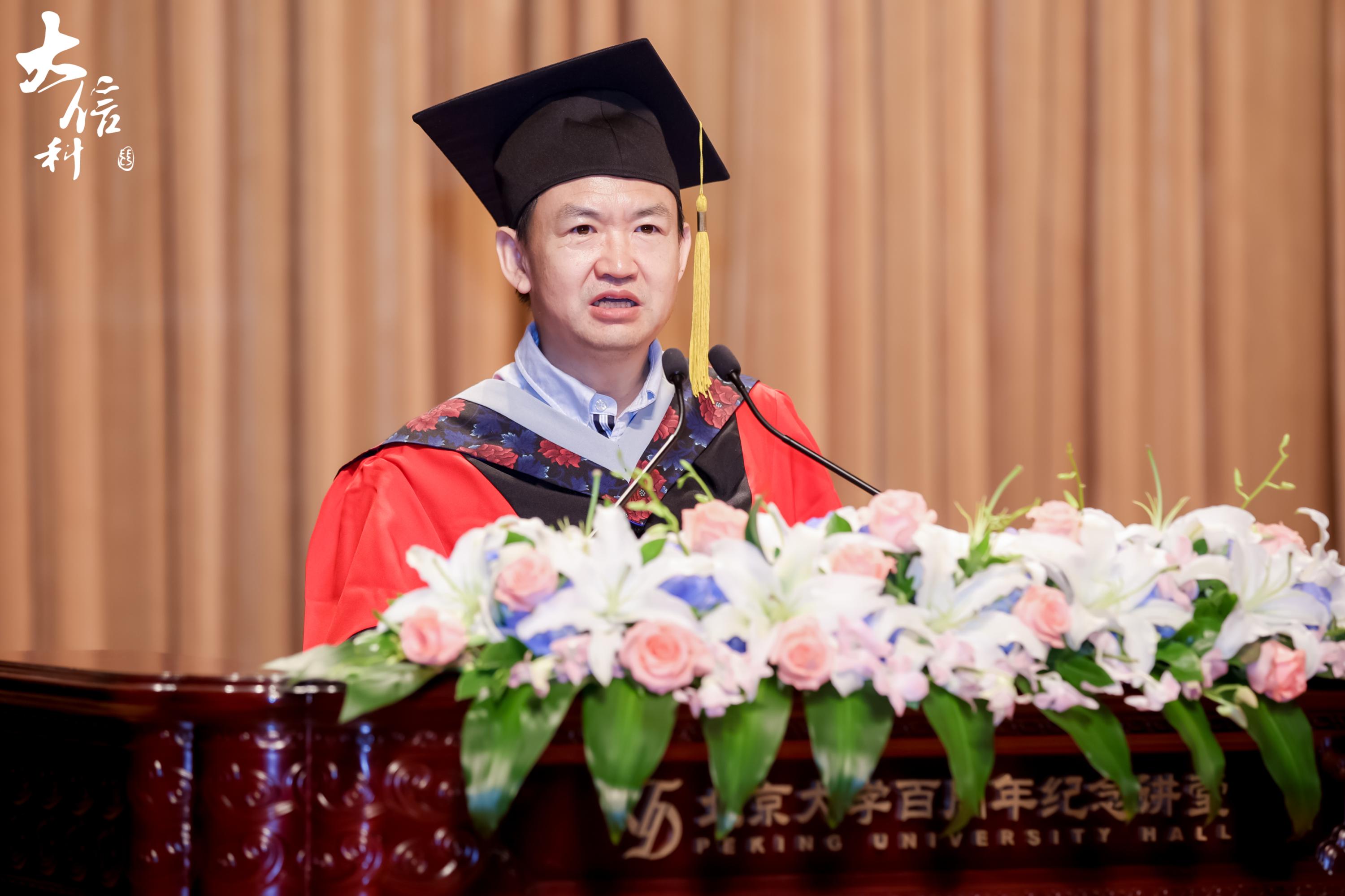 教授、副院长刘敏也为同学们送上祝福。他结合自己毕业20年来的工作经历,为同学们分享了几点人生感悟:一、自信人生二百年,会当水击三千里。无论身处何地,担任何种职位,都应自信满满。二、人生万事须自为,跬步江山即寥廓。希望同学们以奋楫笃行的心态,做久久为功的努力。三、长风破浪会有时,直挂云帆济沧海。坚定自己的信仰,心有所信,方能行远。最后,他希望同学们能够保持北大人的精神傲骨,将北大精神发扬光大。
