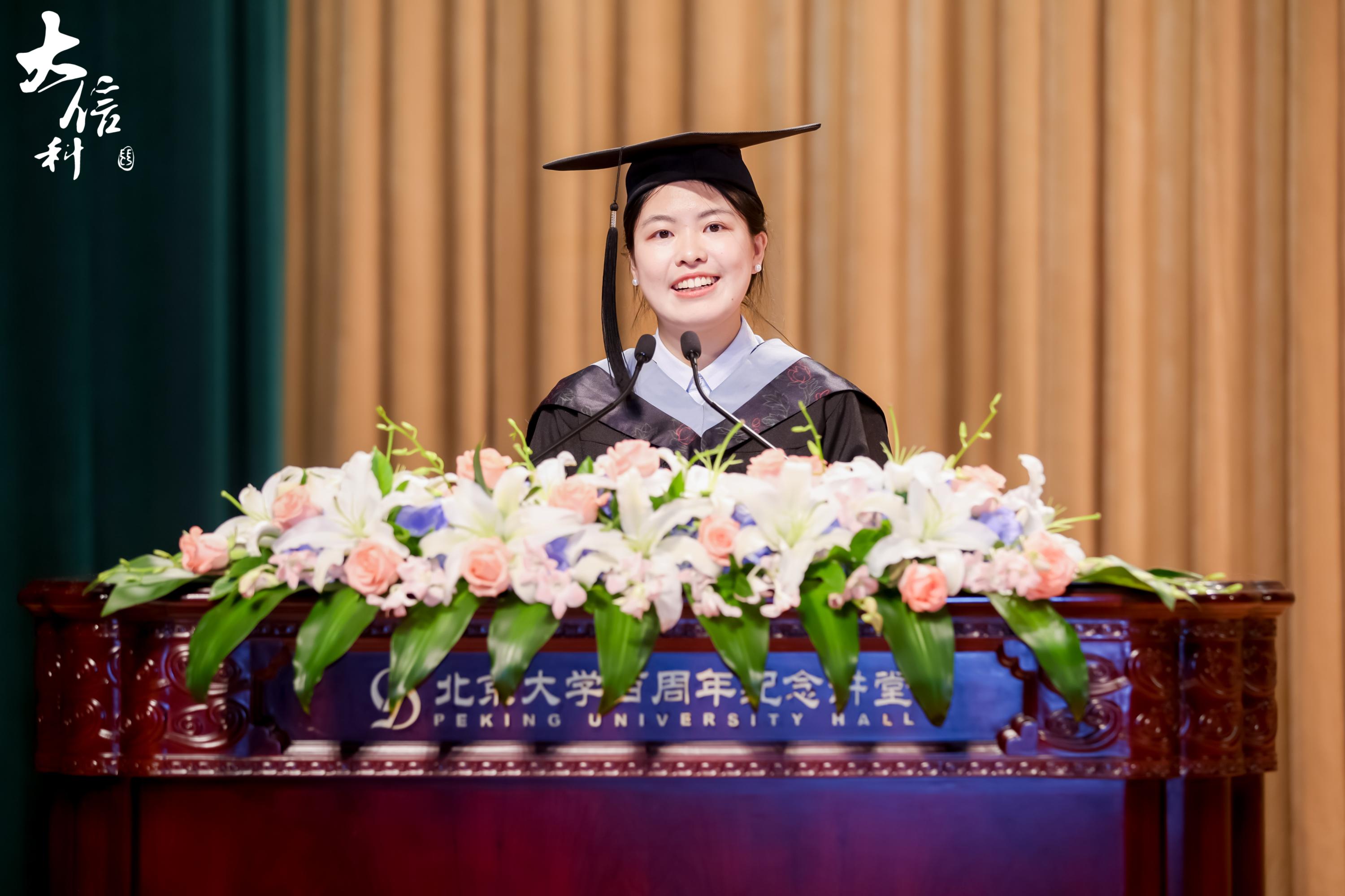 毕业生代表孙诗卉回望来时路,感谢老师与同行者的一路鼓励,为每一位经过了这四年焦虑与收获并存的挑战之旅的同学们,以及自己,道一声祝贺。面对象牙塔外充满挑战、不可确定的时代,她相信,大家能够将自己独特的人生经历化作不断沉淀的经验、自信与勇气,以此面对挑战。最后,她希望大家能够如《燕园情》中的一句“眼底未名水,胸中黄河月”所言,心怀对母校的爱、对信科的爱,把北大信科永远当作可以回去的家。
