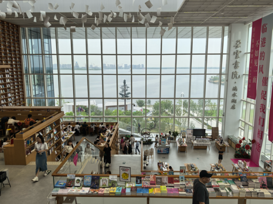 实践团随后来到朵云书院自由参观。三层高的落地窗映照着波光粼粼、水平如镜的滴水湖,书架沿台阶而上,这里有着梦中的知识殿堂的样子,让人不知不觉中褪去心中浮躁、沉浸于书海中。朵云书院不仅是临港建设文化之城、学习型城市的地标,更是人们心灵的栖息地。