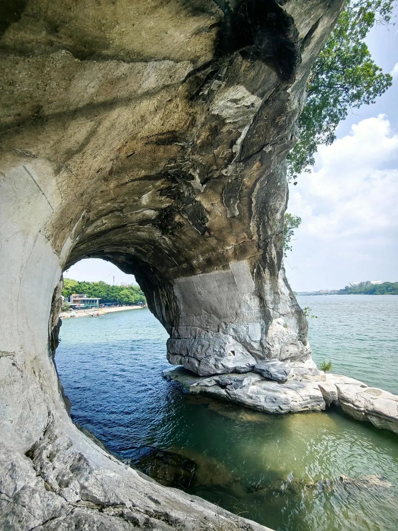 结束了靖江王城之旅后,实践团来到了象鼻山景区。象鼻山坐落在桂林市中心的漓江与桃花江汇流处,因酷似一只站在江边伸鼻豪饮漓江甘泉的巨象而得名。象鼻和象腿之间是面积约一百五十平方米的圆洞,称为水月洞。漓江水穿洞而过,圆洞恰如一轮临水明月,构成“象山水月”的奇景。宋代蓟北处士有诗赞:“水底有明月,水上明月浮。水流月不去,月去水还流。”同学们也纷纷感叹山水之瑰丽、造物之神奇。