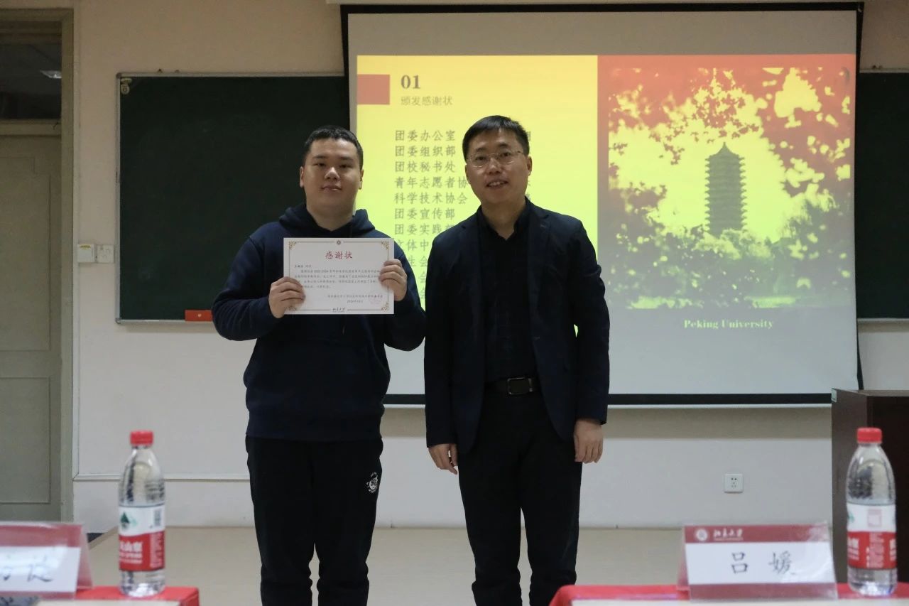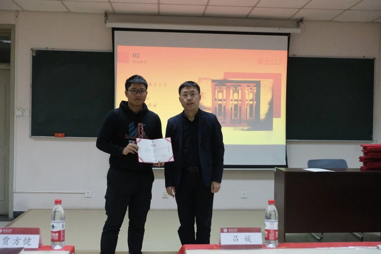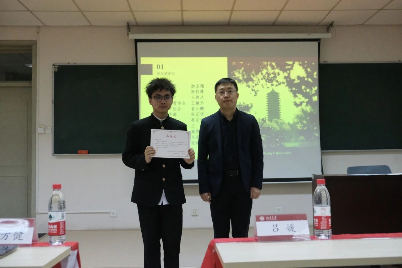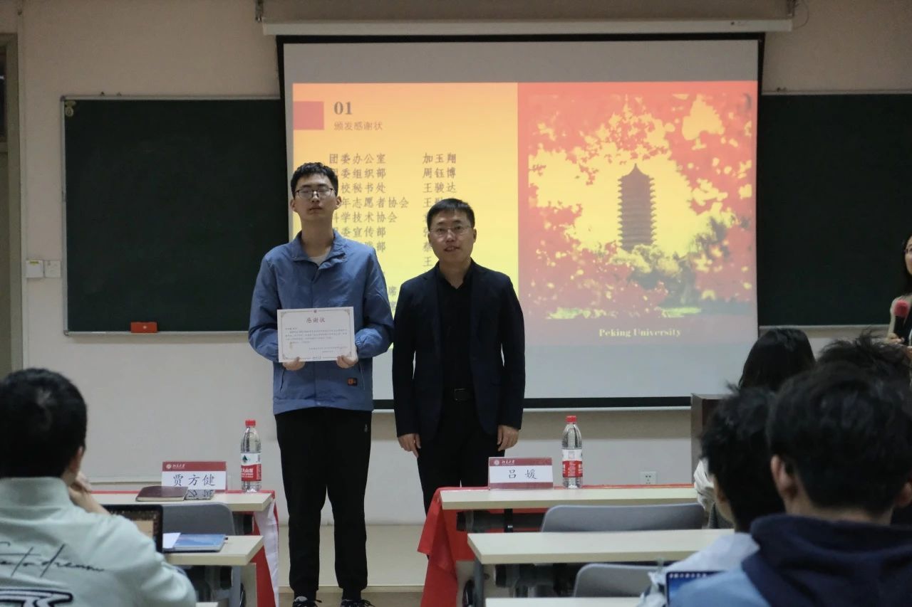 贾方健老师为刚刚卸任的团委各部门负责人及学生会主席团成员颁发感谢状。