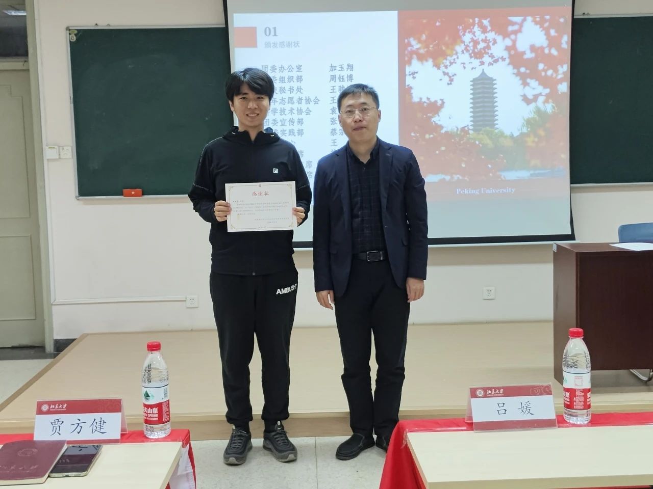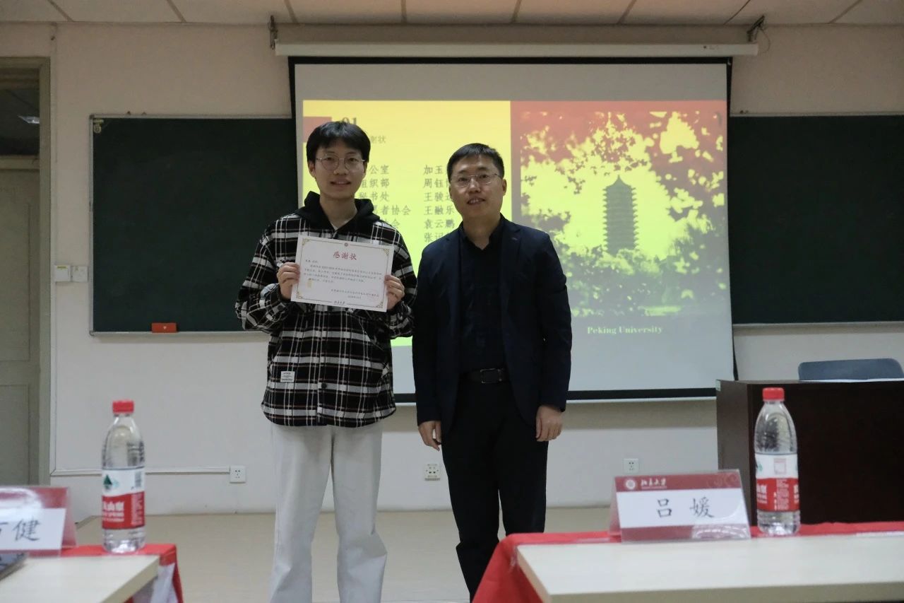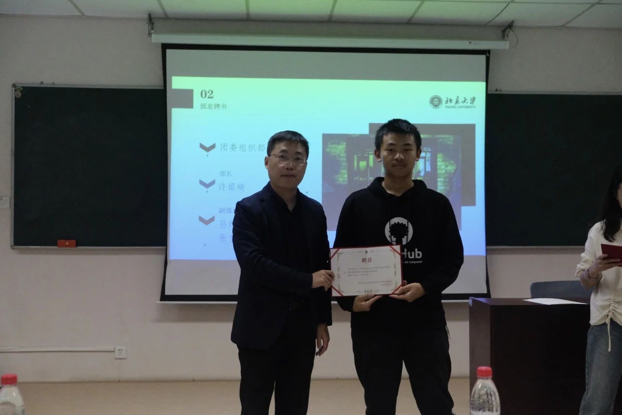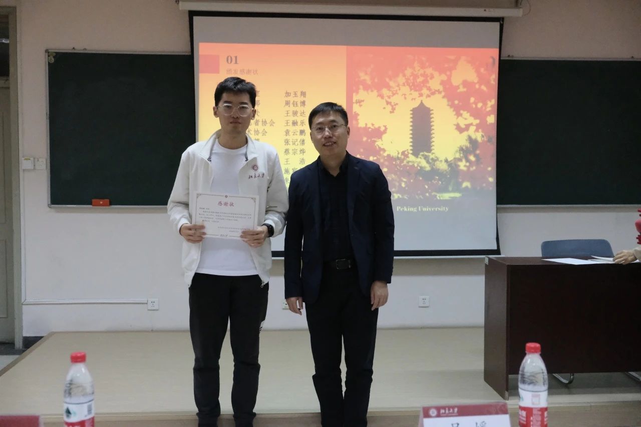 贾方健老师为刚刚卸任的团委各部门负责人及学生会主席团成员颁发感谢状。