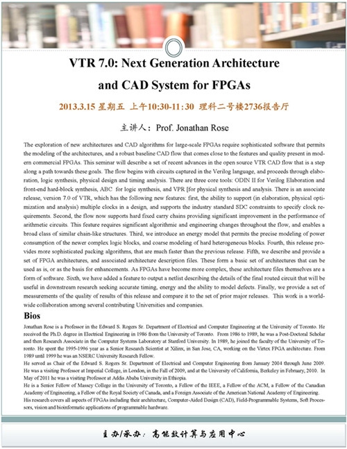 The exploration of new architectures and CAD algorithms for large-scale FPGAs require sophisticated software that permits the modeling of the architectures, and a robust baseline CAD flow that comes close to the features and quality present in modern commercial FPGAs. This seminar will describe a set of recent advances in the open source VTR CAD flow that is a step along a path towards these goals. The flow begins with circuits captured in the Verilog language, and proceeds through elaboration, logic synthesis, physical design and timing analysis. There are three core tools: ODIN II for Verilog Elaboration and front-end hard-block synthesis, ABC for logic synthesis, and VPR [for physical synthesis and analysis. There is an associate release, version 7.0 of VTR, which has the following new features: first, the ability to support (in elaboration, physical optimization and analysis) multiple clocks in a design, and supports the industry standard SDC constraints to specify clock requirements. Second, the flow now supports hard fixed carry chains providing significant improvement in the performance of arithmetic circuits. This feature requires significant algorithmic and engineering changes throughout the flow, and enables a broad class of similar chain-like structures. Third, we introduce an energy model that permits the precise modeling of power consumption of the newer complex logic blocks, and coarse modeling of hard heterogeneous blocks. Fourth, this release provides more sophisticated packing algorithms, that are much faster than the previous release. Fifth, we describe and provide a set of FPGA architectures, and associated architecture description files. These form a basic set of architectures that can be used as is, or as the basis for enhancements. As FPGAs have become more complex, these architecture files themselves are a form of software. Sixth, we have added a feature to output a netlist describing the details of the final routed circuit that will be useful in downstream research seeking accurate timing, energy and the ability to model defects. Finally, we provide a set of measurements of the quality of results of this release and compare it to the set of prior major releases. This work is a world-wide collaboration among several contributing Universities and companies.