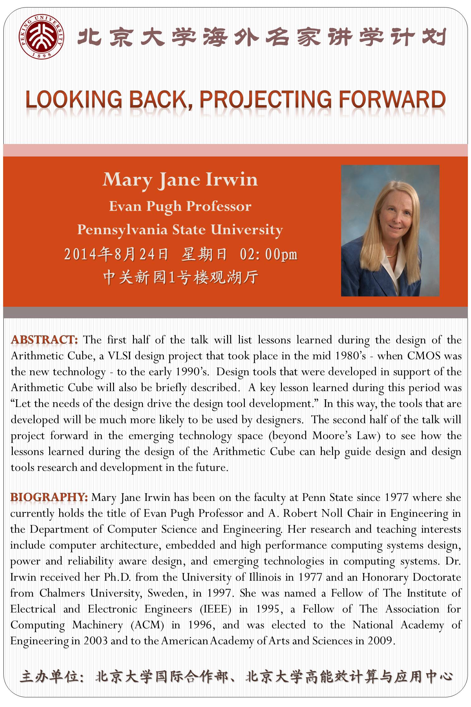 Biography:Mary Jane Irwin has been on the faculty at Penn State since 1977 where she currently holds the title of Evan Pugh Professor and A. Robert Noll Chair in Engineering in the Department of Computer Science and Engineering. Her research and teaching interests include computer architecture, embedded and high performance computing systems design, power and reliability aware design, and emerging technologies in computing systems. Dr. Irwin received her Ph.D. from the University of Illinois in 1977 and an Honorary Doctorate from Chalmers University, Sweden, in 1997. She was named a Fellow of The Institute of Electrical and Electronic Engineers (IEEE) in 1995, a Fellow of The Association for Computing Machinery (ACM) in 1996, and was elected to the National Academy of Engineering in 2003 and to the American Academy of Arts and Sciences in 2009.