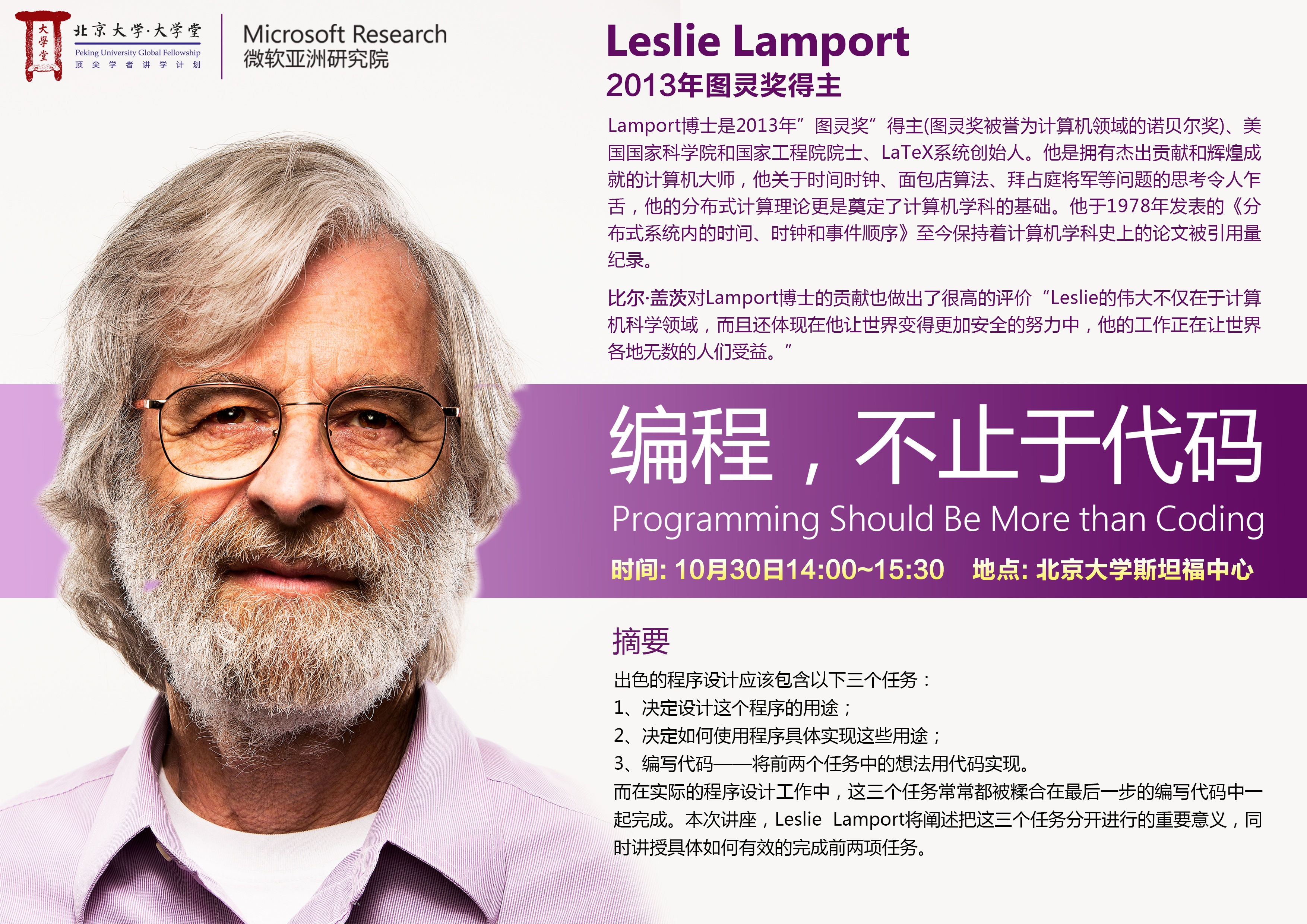 “大学堂”顶尖学者讲学计划之2013图灵奖获得者Leslie Lamport博士在未名湖畔跟你聊聊编程那些事儿